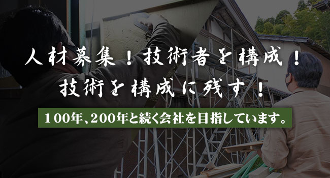 | 福利厚生・待遇 | 各種保険完備、特退共・自社退職金制度完備、作業着支給・道具貸与、マイカー通勤OK、資格取得補助制度完備、昇給随時、賞与年1回(業績に応じて)、社員年1回あり |